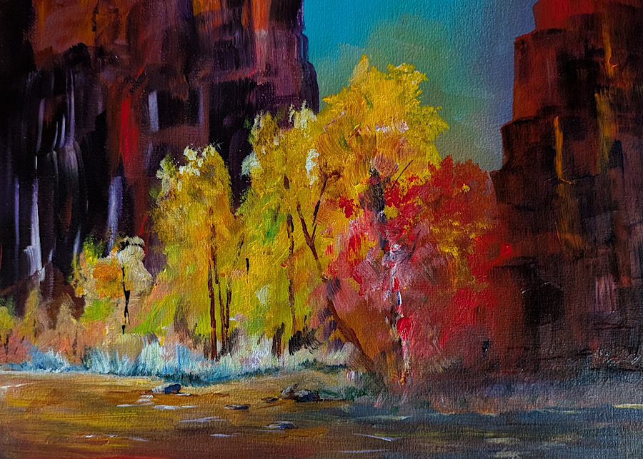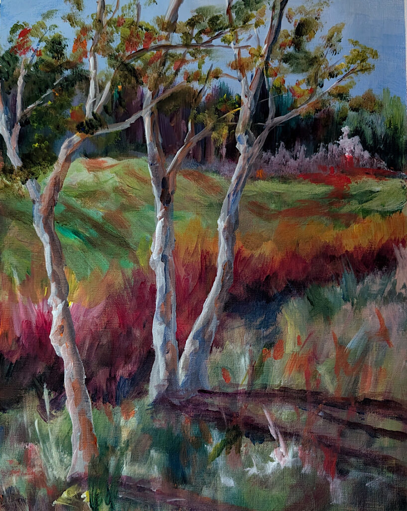 “I relish the infinite possibility of that first mark on a canvas. I enjoy the chaos of the middle painting when I wonder if I should throw the whole thing in the trash. I savor the coalescing surprise of the final touches and the moment I can say, “It’s done.” For me the journey is as important as the destination and the process is as important as the final result. In that I find peace.”